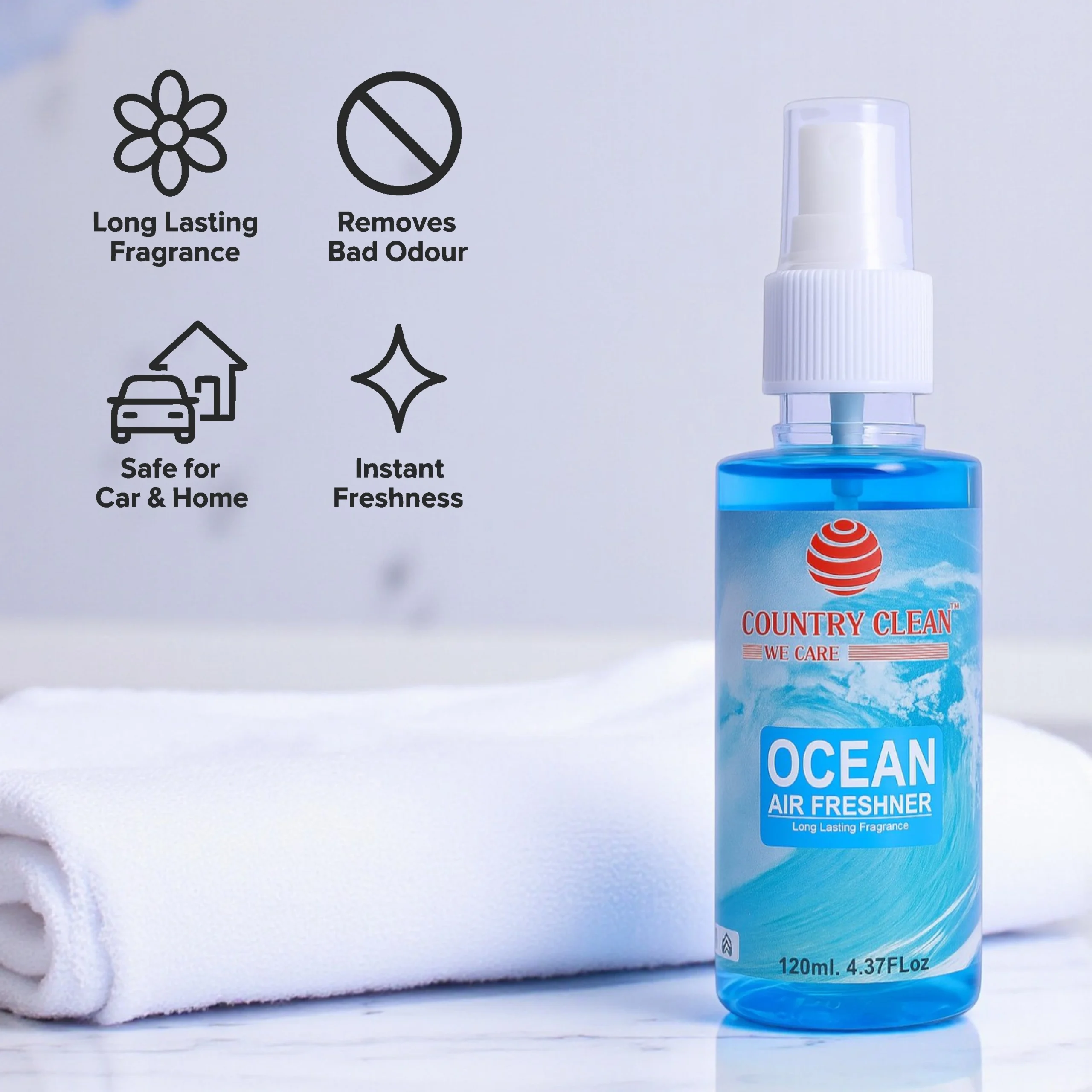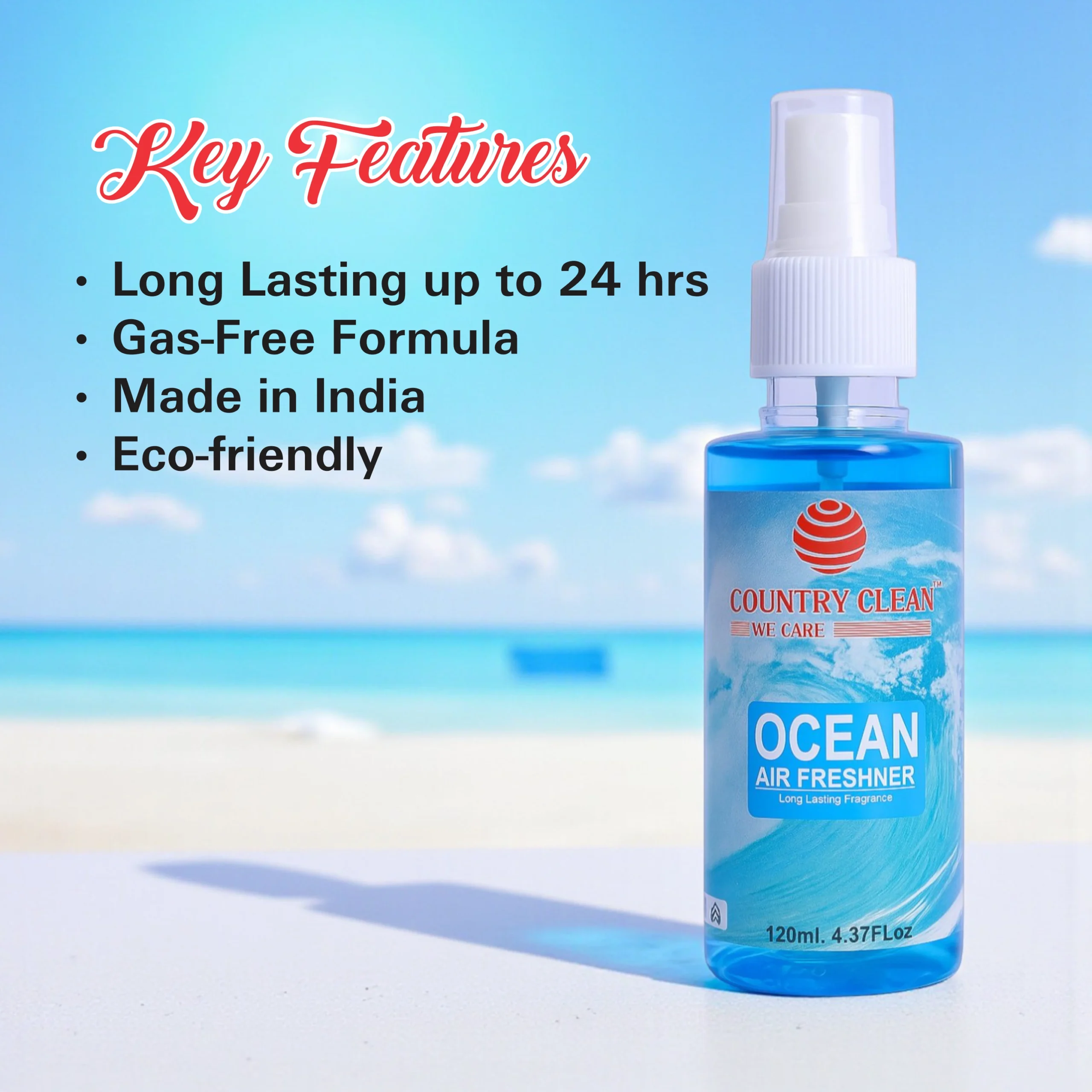 Bring the refreshing breeze of the ocean into your space with our Ocean Air Freshener. Its clean, invigorating fragrance instantly eliminates odors and revitalizes your car, home, or office.